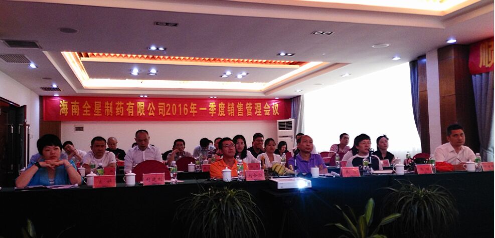 2016年4月14日-15日,海南全星制藥有限公司在烏蘭大酒店召開2016年一季度銷售管理會議,公司董事長兼總經理劉全勝及各部門總監、營銷部全體成員及全國各省區經理出席會議,會議由營銷總監丁月祥主持。